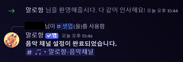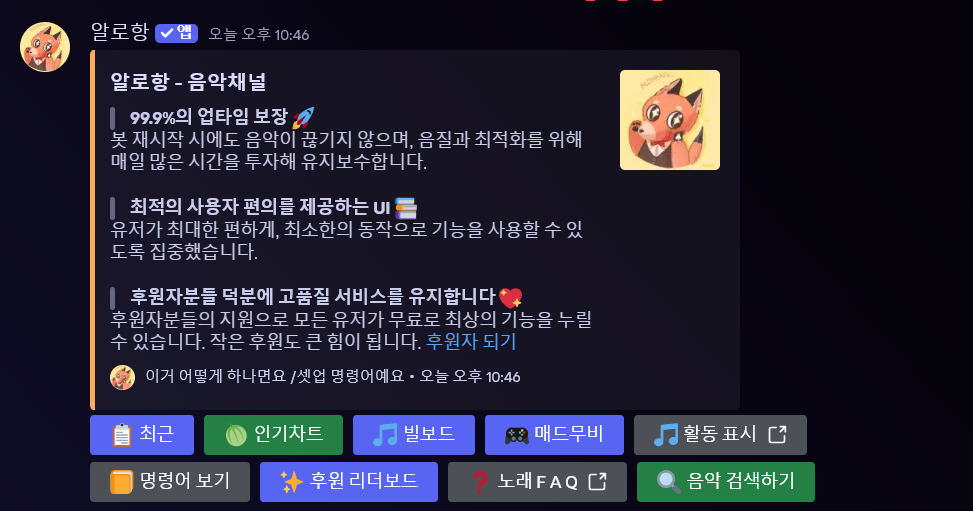 셋업을 사용하면 알로항 음악 재생 제어판을 생성할 수 있습니다. 만약 알로항이 채널을 만들지 못한다면 알로항 역할에 관리자 권한을 지급해주세요.