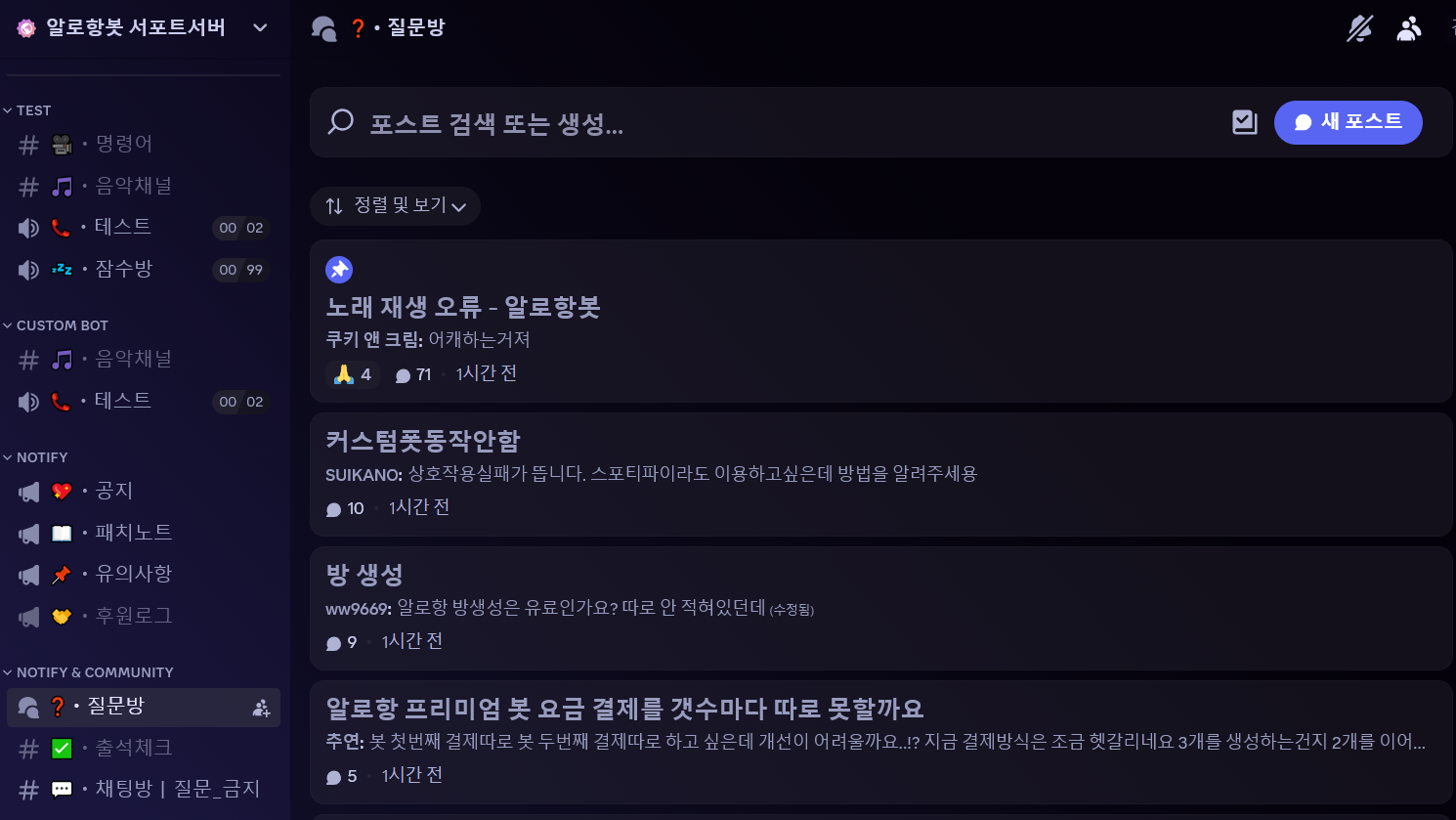 질문 채널에서 개발자에게 건의사항, 문제를 전달하고 도움받을 수 있습니다.