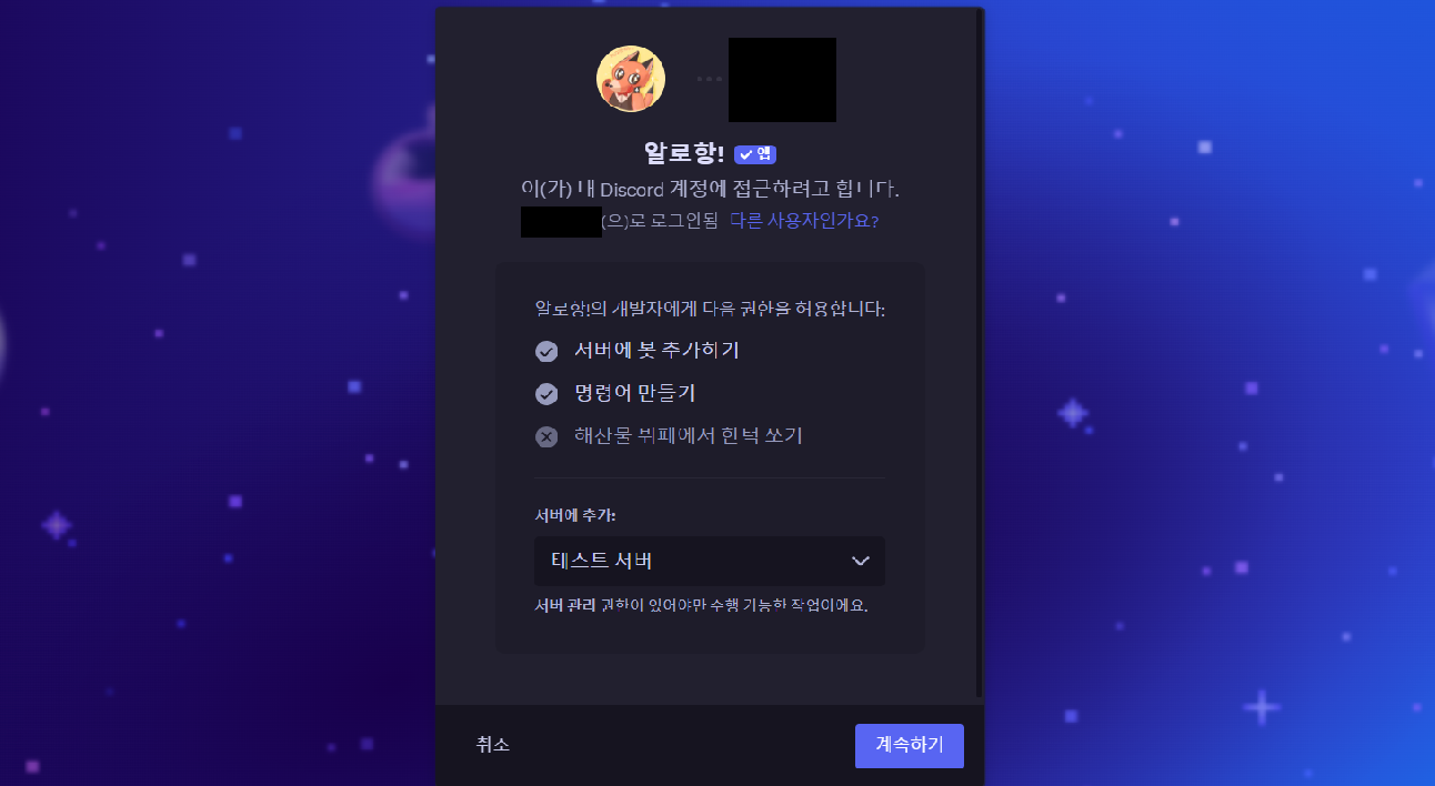 알로항 봇을 추가할 서버를 설정하고 자신의 계정이 맞는지 확인한 후 초대합니다. 계속하기를 누른 후 봇의 관리자 권한 버튼을 해제하지 않고 초대합니다.