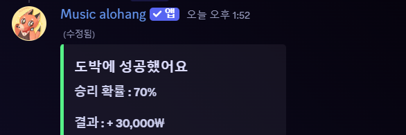 운 좋은 분들에게 권장하며 복권 기능에 너무 거액을 걸기보단 원금을 남기고 투자하시는걸 추천드립니다. 절대로 복권 한번 성공했다고 두번 세번 하지 말고 명령어 번갈아가며 쓰기, 원금 남겨두기 기억해주세요.